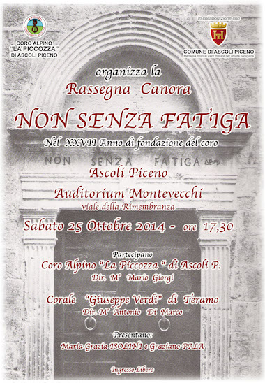 organizza la Rassegna Canora "NON SENZA FATIGA" in occasione del XXVII Anno di fondazione del coro Ascoli Piceno - Auditorium Montevecchi - viale della Rimembranza